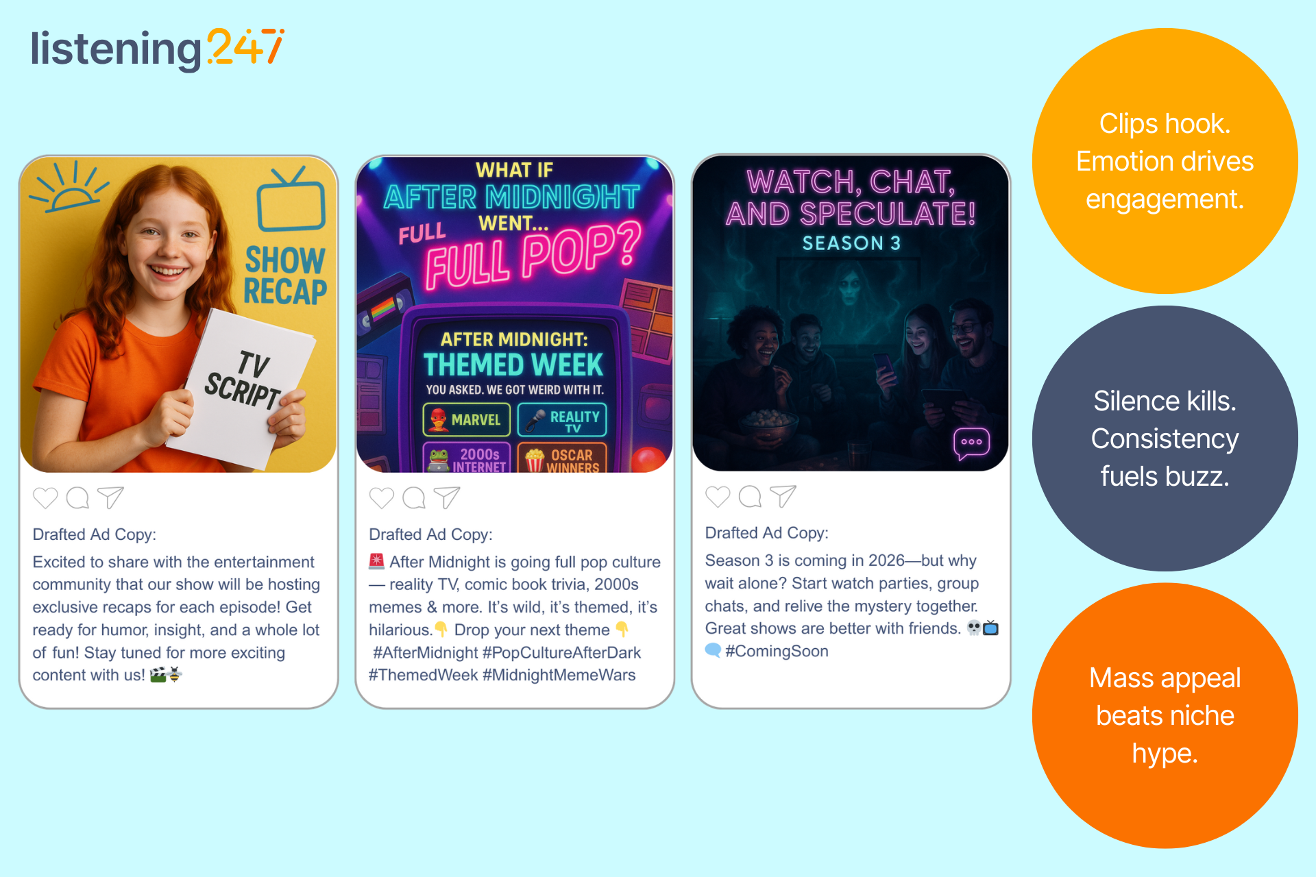 listening247, in partnership with Double A Labs and a top film production and distribution company about the “Why and How Social Media Influences Viewership or Brand Perception.” The objective was to: