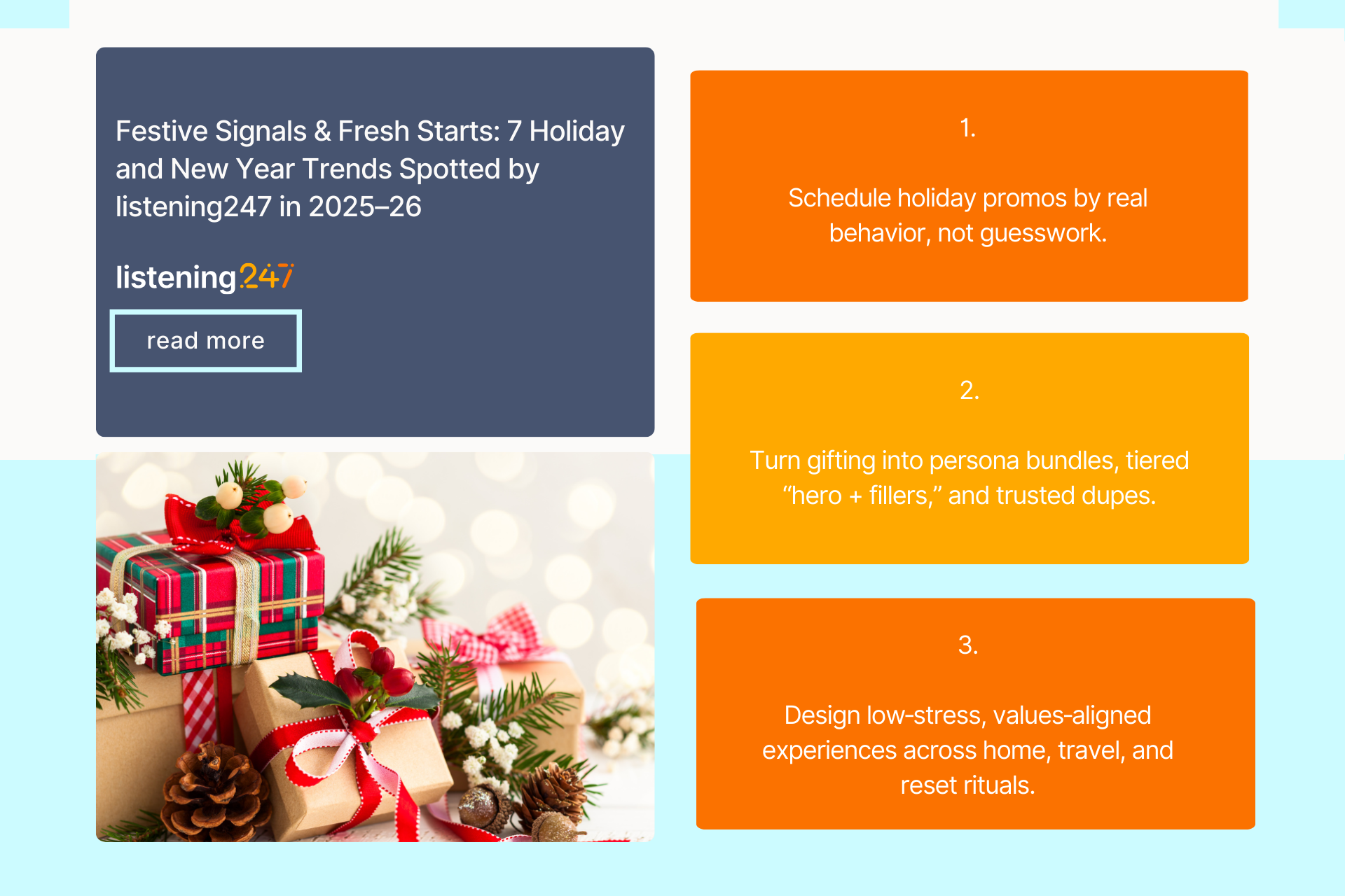 listening247’s analysis of 58,000+ public posts and conversations across X, Instagram, TikTok, Reddit, forums, and blogs, from the 2024 holiday season through today, reveals that the 2025–26 holiday season is dominated by seven themes: